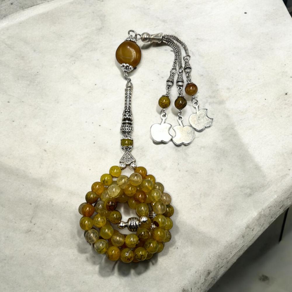 سبحة أنيقة مصنوعة من حجر العقيق البرازيلي الطبيعي، بتفصيل دقيق يبرز جمال اللون ونعومة الملمس. تصميم حصري من متجر البانا لعشاق التميز.