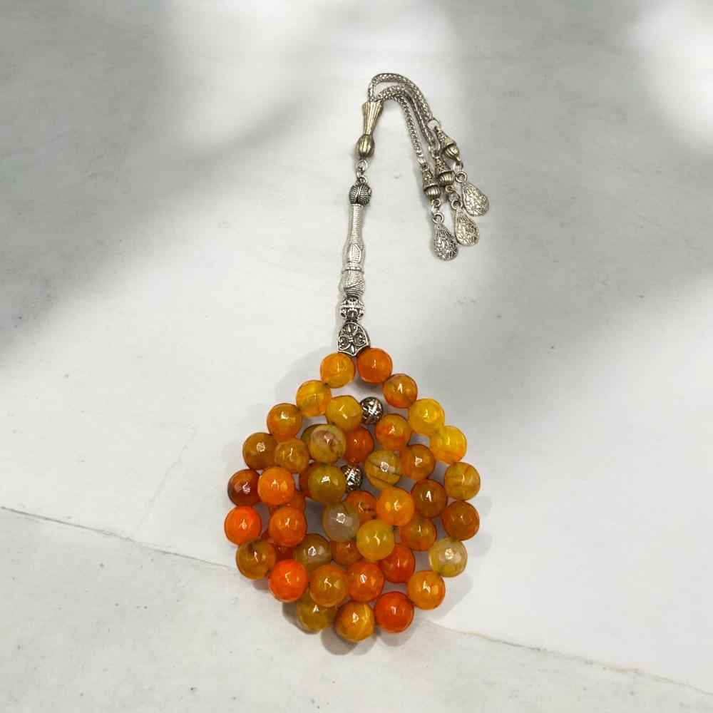 سبحة أنيقة مصنوعة من حجر العقيق الأصفر البرازيلي الطبيعي، بتفصيل دقيق يبرز جمال اللون ونعومة الملمس. تصميم حصري من متجر البانا لعشاق التميز.