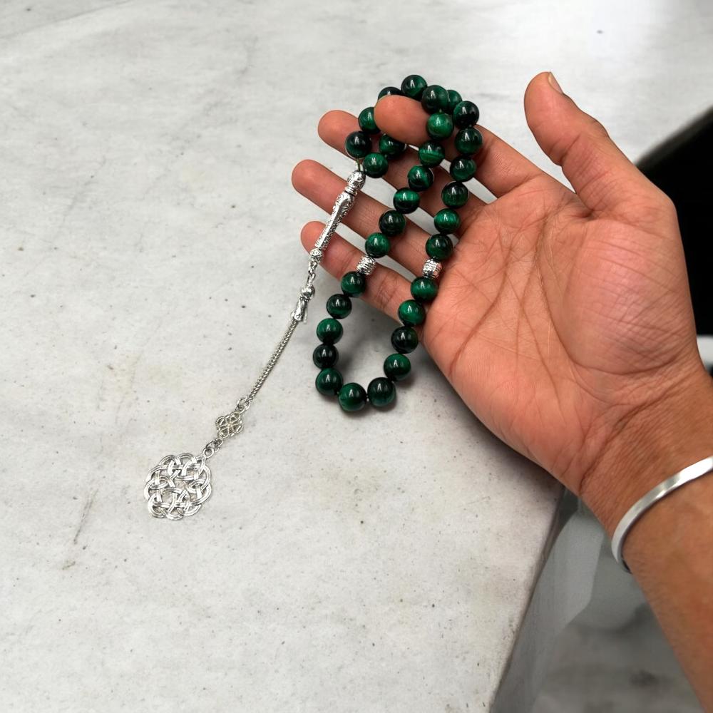 • لمعان الحجر الأخضر يجعل السبحة تبهر الأنظار بلمعة طبيعية.