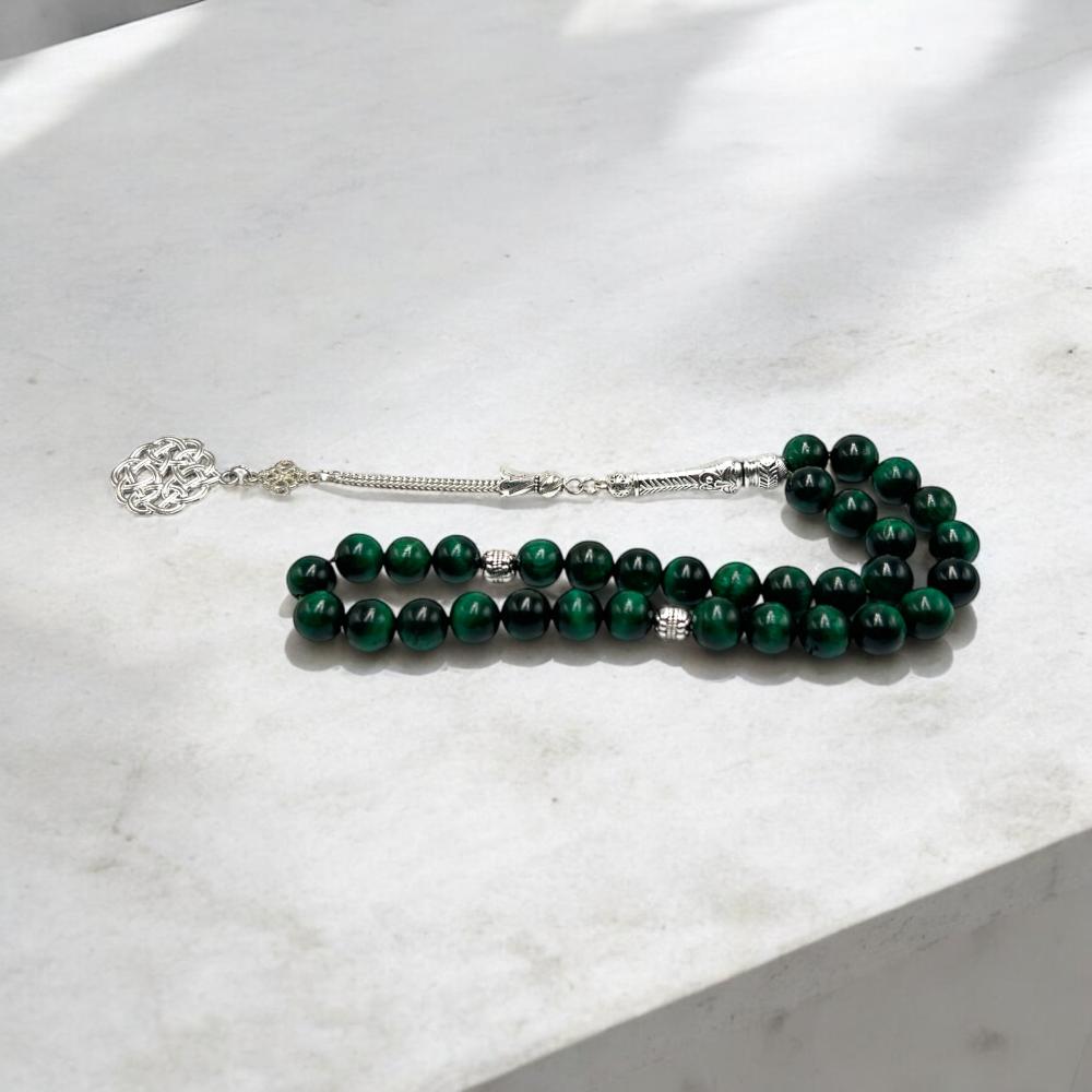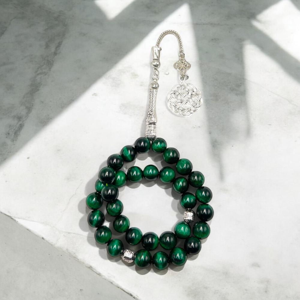 أضف لمسة من الفخامة والجمال إلى مجموعتك مع هذه السبحة الرائعة من حجر عين النمر الأخضر عبر msabehalbana